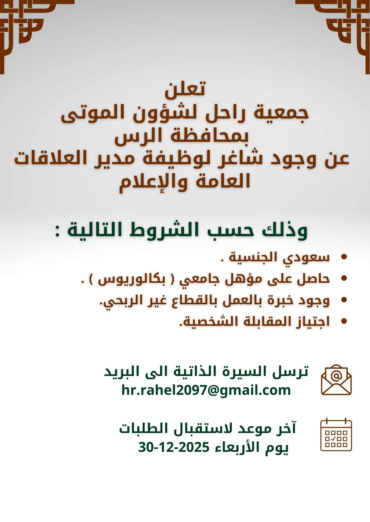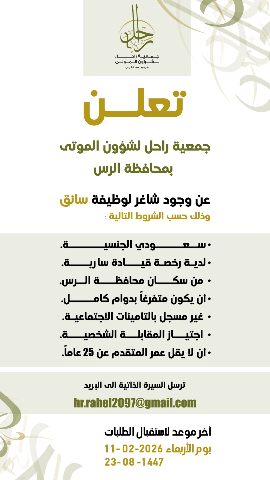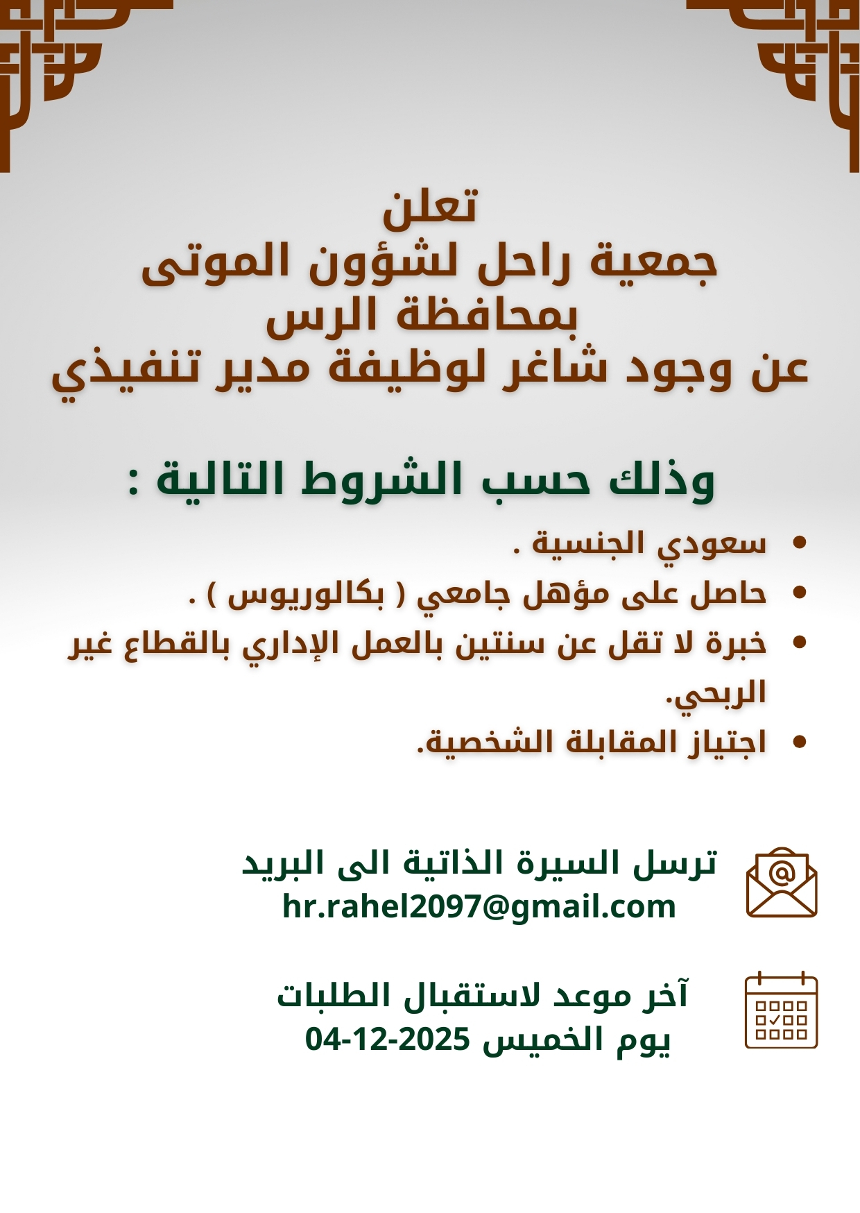 جمعية راحل لشؤون الموتى جمعية راحل لشؤون الموتى بمحافظة الرس، جمعية سعودية أهلية تحت إشراف وزارة الموارد البشرية والتنمية الاجتماعية، مسجلة برقم (2097)، تهدف إلى .. تعرف علينا أكثر البرامج والأنشطة  مستفيد 101  نشاط 21  مستفيد 101