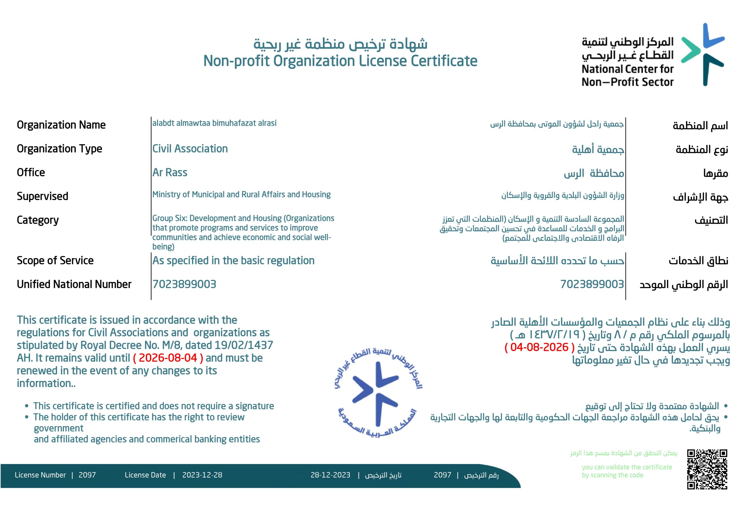 أن تكون نموذجا يحتذى به في ما يتعلق بشؤون الموتى من وقت مماته ، وتوعية المجتمع بالأحكام والأنظمة المتعلقة بذلك.